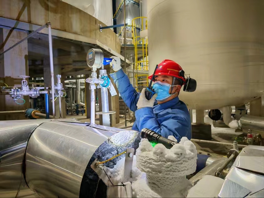 “春節(jié)期間,我們一定堅守崗位,保持最佳狀態(tài),確保各項工作有序推進。” 空分車間員工堅定地說道。“春節(jié)期間更要打起十二分精神,不能有絲毫懈怠。” 他們密切關(guān)注著設備的運行參數(shù),仔細記錄著每一個數(shù)據(jù)。“走,除夕夜檢查不能停,一定要確保萬無一失。”夜色中,他們頂著瑟瑟寒風認真巡檢,檢查空壓機運行狀態(tài),保障儀表氣穩(wěn)定供應。為了確保后序工段氮氣吹掃和密封氣供應,空分車間定時對真空液氮儲槽進行充液,為氮氣供應保駕護航。